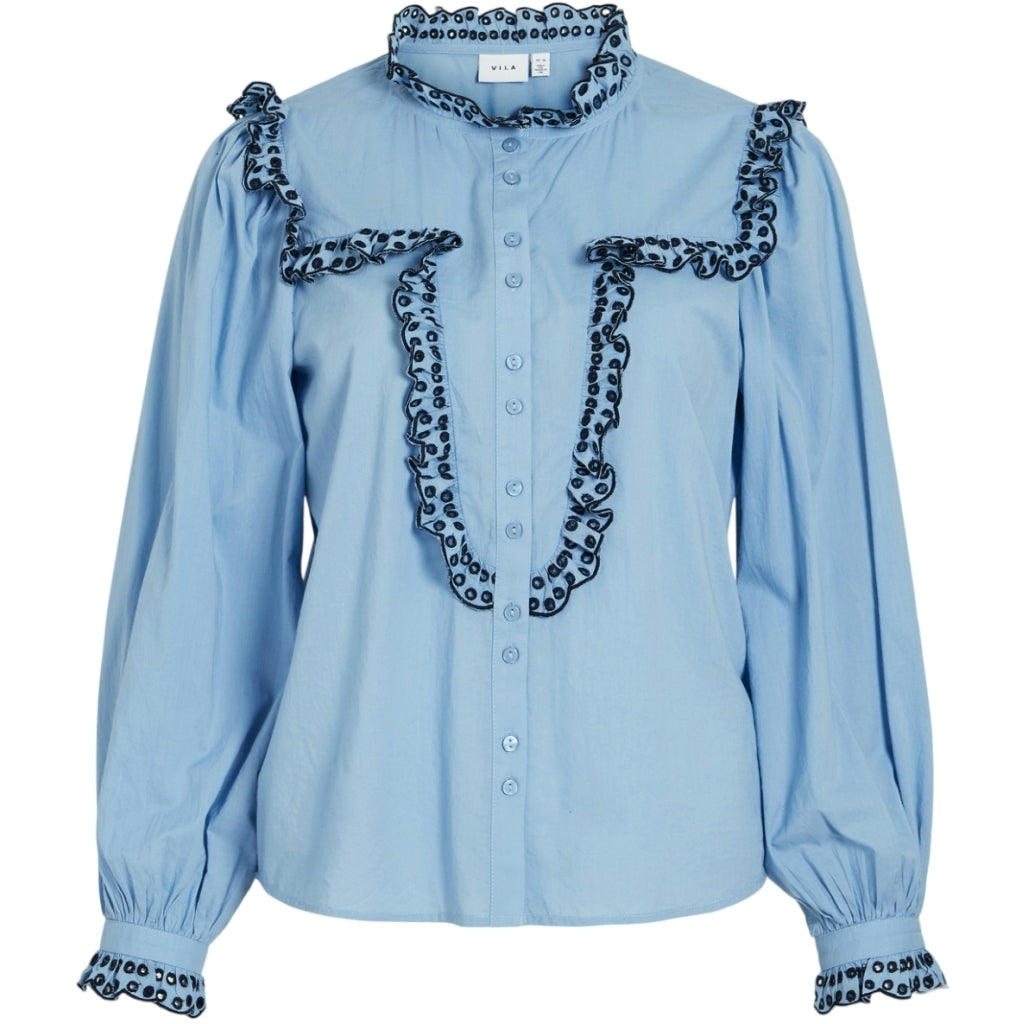 VILA Skjorte VIJANNE i Blissful Blue er et must-have for den modebevidste kvinde. Denne skjorte kombinerer stil og komfort. Hvilket gør den perfekt til enhver lejlighed. Her er de vigtigste detaljer.